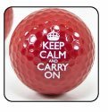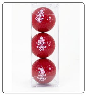 Keep Calm and Carry On on the Golf CourseThese red golf balls with imprinting reproduce and introduce the original Keep Calm and Carry On poster print to the links. Slip a few of these Keep Calm and Carry On golfballs in with your Titlest Golf Balls and you may be the talk of the Golf Club. A golf prize or golf gift "Fore" you or your friends. A set of three Keep Calm and Carry On golf balls in a clear acetate gift box.