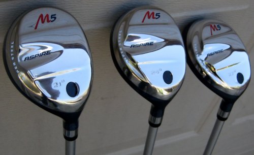 2011 Model Womens Right Handed M5 Aspire Hybrid Set #3,4,5 Golf Clubs... These 3 clubs are way easier to hit than any long iron and will change your game. Replace those hard to hit 3,4,5 irons with these technologically advanced hybrids, and you'll be hitting the ball high, straight, and far, and lowering your scores. This set includes the #3 (21 degree loft), #4 (24 degree loft), and #5 (27 degree loft), and all clubs feature Ladies Graphite shafts and come with matching M5 Aspire headcovers. These clubs will certainly elevate your game.